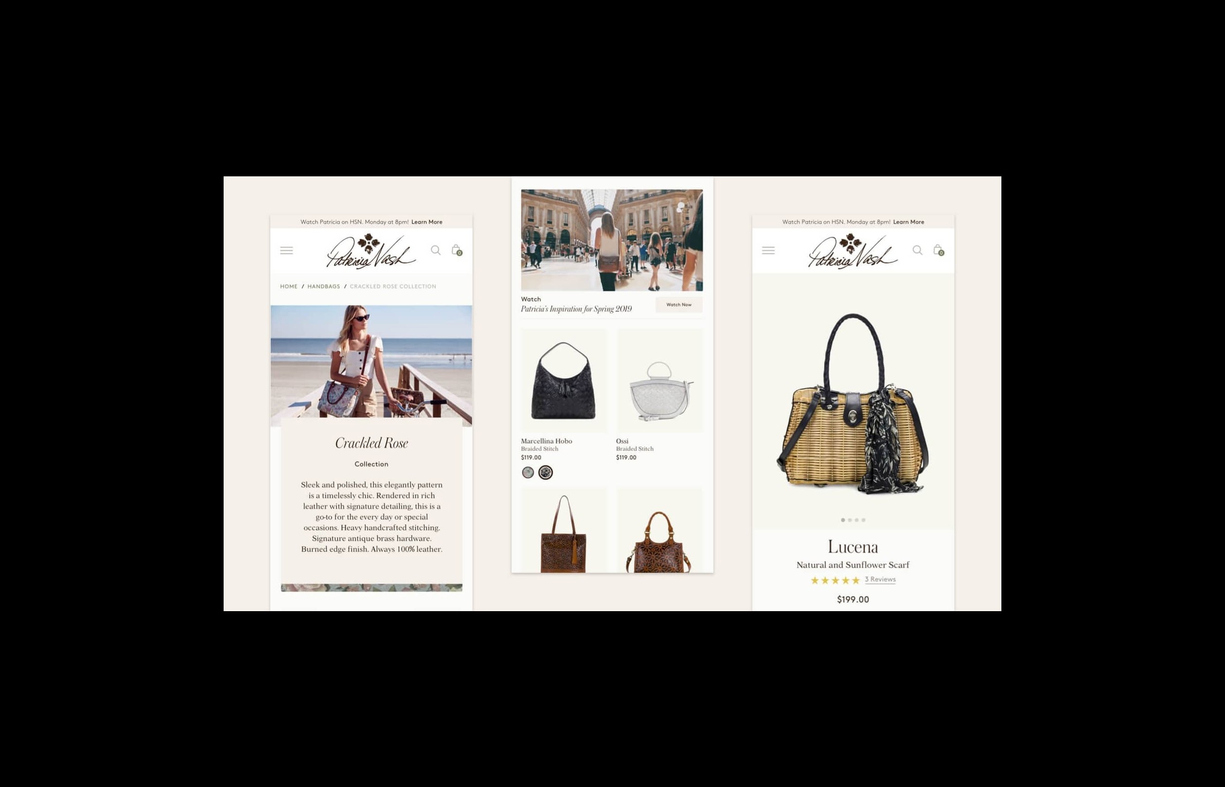 Patricia Nash creates collections of bags, shoes and jewelry for women and men, inspired by travels and fond memories of cherished people and places.I lead UX, design, and art direction of content for the entire site as well as emails, social, and digital marketing.